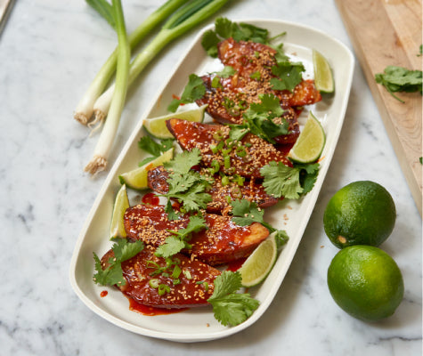 1. Place the chicken in the reserved frypan and pat dry with paper towels. Pour about 1/3 of the sauce over the top and use a pastry brush or your hands to spread into an even layer across the entire top of the chicken. Tuck the carrots and oranges in the pan around the chicken, and drizzle a few more spoons of sauce evenly around. Reserve the rest of the sauce for serving with the finished chicken.