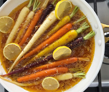 1. Wipe clean the frypan add in the sugar and water. Gently swirl the pan until the sugar is evenly hydrated by the water, taking care not to get any sugar up the sides. Place the frypan back on the stovetop over medium high heat and boil until the bubbles start to slow down considerably, about 4 to 5 minutes. At this point keep a close eye as it will begin to caramelize and turn amber quickly. As needed, very carefully and gently swirl the pan to ensure all the sugar colors evenly. As soon as it’s a medium amber shut off the heat and stir in the butter, reserved wine syrup, and a pinch of kosher salt until everything is fully combined. (If needed, turn the stove back on a low heat for a moment to fully dissolve the caramel and incorporate everything.)