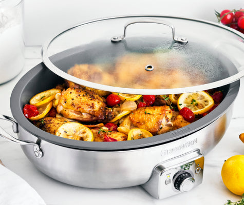 Shrimp and veggie stir fry in the GreenPan Premiere Stainless Steel Elite Oval Electric Skillet