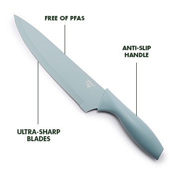 Enjoy a sleek, coordinated look with blades and handles that match in bold, vibrant colors, creating a unified and stylish kitchen aesthetic