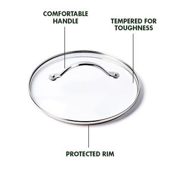 These universal tempered glass lids feature tough stainless steel top handles and stainless steel rims. Designed to retain heat and prevent splashing, these lids fit all GreenPan collections.