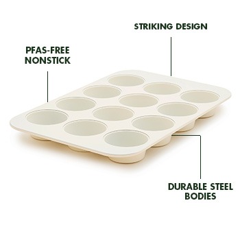 From savory bites to classic muffins, this 12-cup muffin pan makes baking easy. Heavy-gauge aluminized steel ensures lasting performance, while PFAS-free ceramic nonstick provides effortless release.