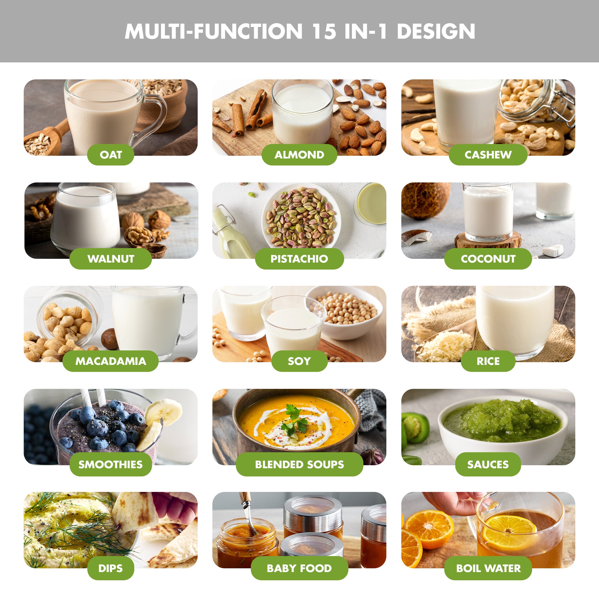 Create dairy-free almond, oat, cashew, walnut, pistachio, coconut, macadamia, rice, and soy milk. Also perfect for blending delicious smoothies, soups, sauces, dips, baby food, and even boiling water.
