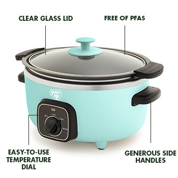 This 3.5-quart slow cooker makes flavorful, worry-free meals easy. The removable pot is stovetop and oven safe up to 400˚F, and our PFAS-free ceramic nonstick ensures easy cleanup. Compact, versatile, and simple to use—perfect for everyday cooking.