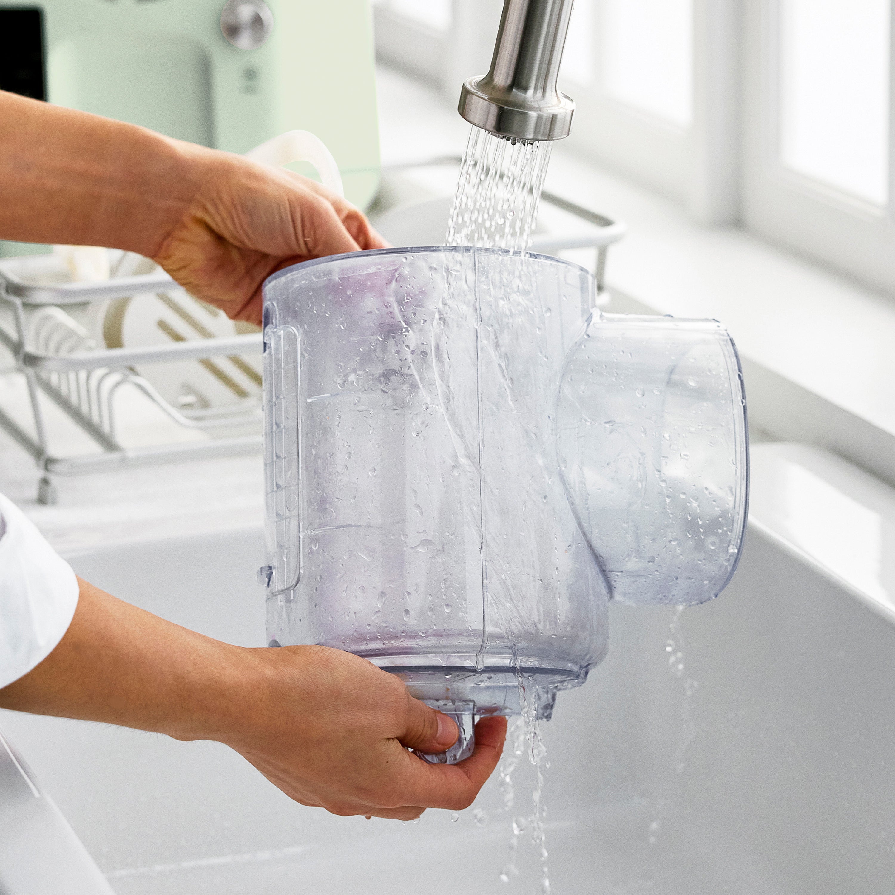 The stirring blade, mixing bowl, two-part removable drip tray, extrusion head, cleaning brush, and removable decorative cover are top-rack dishwasher safe.