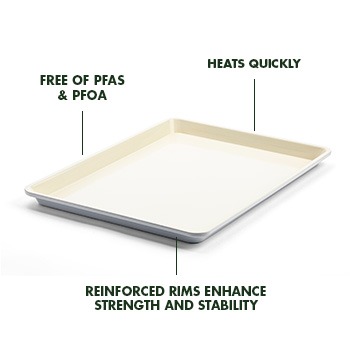 Featuring a healthy ceramic nonstick coating, this cookie sheet is perfect for everything from baked sweets to savory creations like nachos, chicken wings, or easy sheet-pan suppers.
