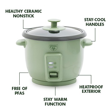 Turn ordinary rice into fluffy, flavorful masterpieces with the flip of a switch! This rice cooker makes up to 6 cups of cooked rice and features our PFAS-free ceramic nonstick coating for healthier meals and effortless cleaning.