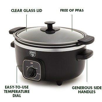 This 3.5-quart slow cooker makes flavorful, worry-free meals easy. The removable pot is stovetop and oven safe up to 400˚F, and our PFAS-free ceramic nonstick ensures easy cleanup. Compact, versatile, and simple to use—perfect for everyday cooking.