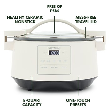 Bring power and performance anywhere you need it with this spacious 8-quart slow cooker featuring a locking lid that makes it easy to bring big meals to get-togethers, parties, or wherever you're hungry. Our signature PFAS-free nonstick delivers effortless cleanup and the removable pot lets you sear on the stovetop, then go low and slow to bring out flavor.