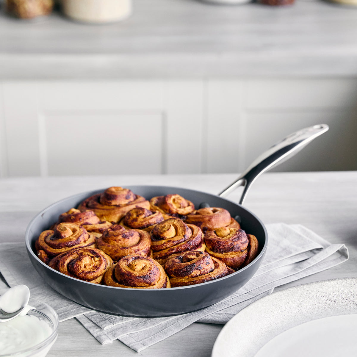 These pans have unique stay-flat bases that are designed to flex when they’re heated, which means oil stays where you put it so you can use less.