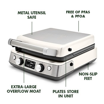 The removable plates store in the unit, so you’ll never have to go looking for the Belgian or classic waffle plates when you want to switch them out.