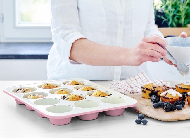 Made of heavy-duty steel for quick and even heating, this muffin pan is built to last through countless baking sessions. This healthy ceramic muffin pan offers effortless release for everything from sticky buns to pineapple upside-down cupcakes.