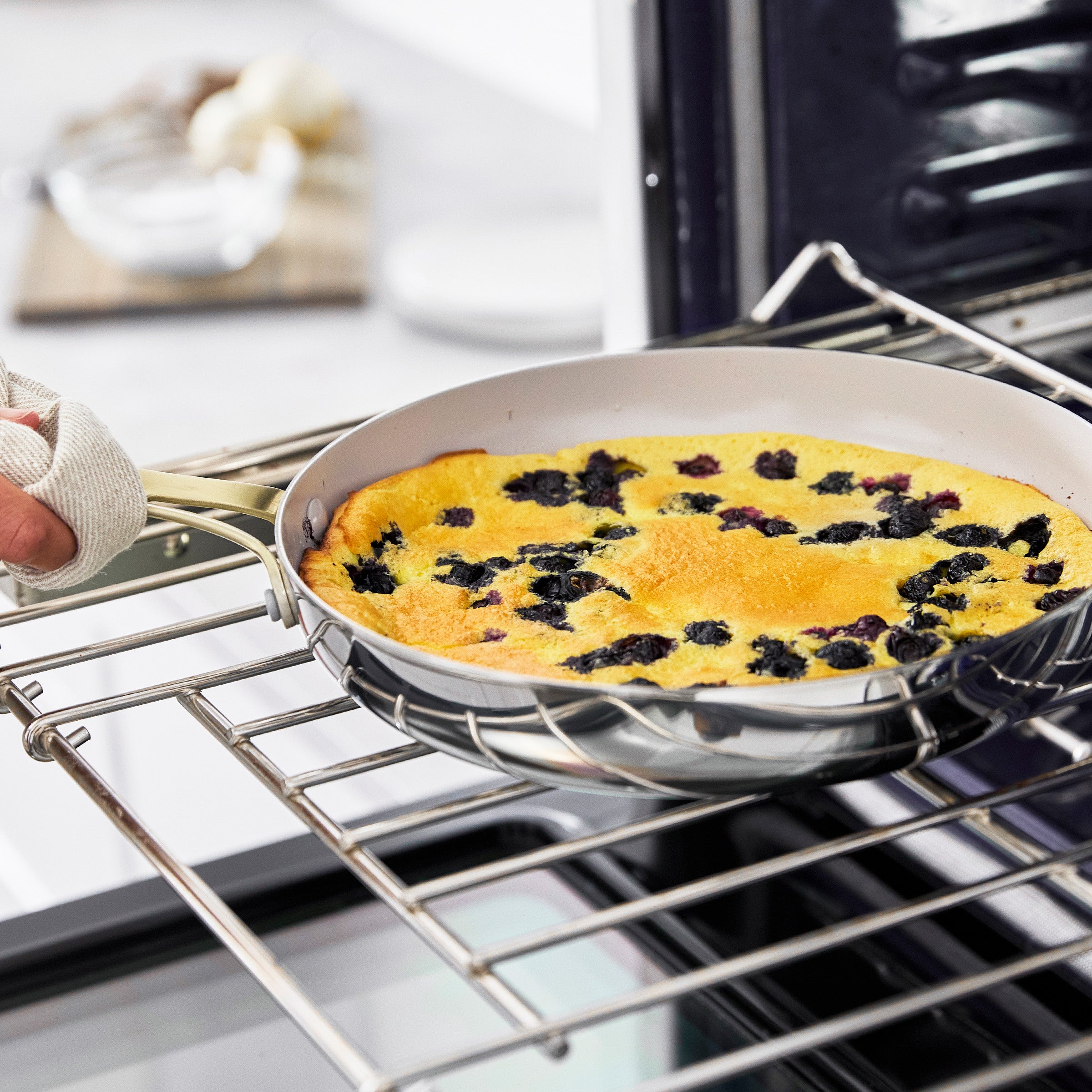This Nova Stainless 2-piece frypan set combines elegant design with everyday performance. Crafted from 3-ply stainless steel with a rapid-heating aluminum core, these pans feature our diamond-infused ceramic nonstick for easy, PFAS-free cooking. With induction compatibility, oven-safe strength, and stylish champagne handles, they're designed to elevate every routine.