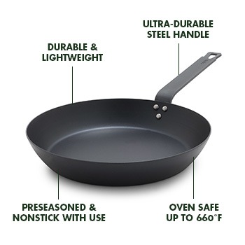 Pre-seasoned to get you started right away, the carbon steel body develops a nonstick patina that gets better every time you use it.