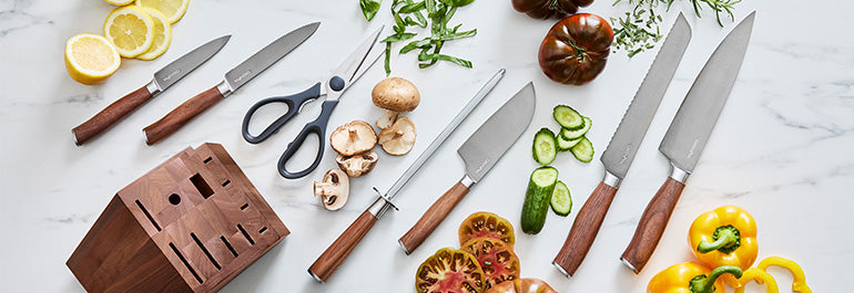 We start with recycled steel and eco-friendly walnut handles to minimize our environmental impact. Each blade is cryogenically treated to remove residual stresses, then hand sharpened and coated with titanium to deliver tough, long-lasting blades for years of precise prep.