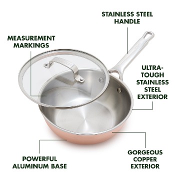 This 8-piece copper clad set blends stunning strength with professional performance. Each pan features a copper exterior, a responsive aluminum base, and a stainless steel interior built to last. Plus, the durable rims, stainless steel handles, and measurement markings make every detail count.