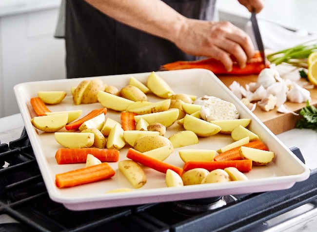 Featuring a healthy ceramic nonstick coating, this cookie sheet is perfect for everything from baked sweets to savory creations like nachos, chicken wings, or easy sheet-pan suppers.
