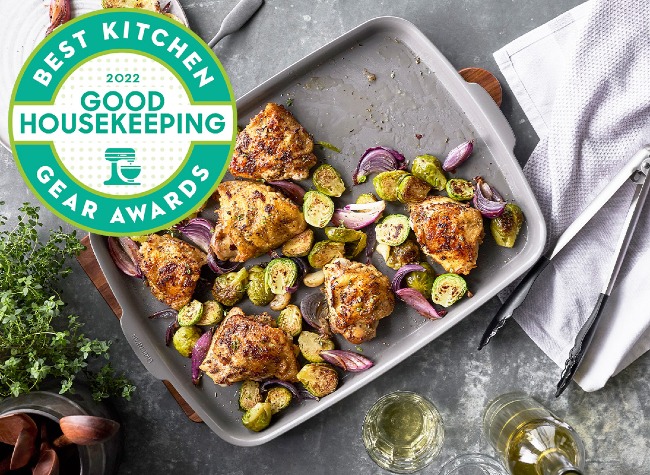 A remarkable ceramic nonstick coating, a unique heavyweight gauge, and one-piece design create the single best way to cook in the oven.