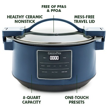 Bring power and performance anywhere you need it with this spacious 8-quart slow cooker featuring a locking lid that makes it easy to bring big meals to get-togethers, parties, or wherever you're hungry. Our signature PFAS-free nonstick delivers effortless cleanup and the removable pot lets you sear on the stovetop, then go low and slow to bring out flavor.