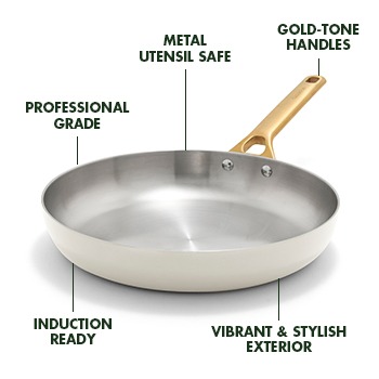 Showstopping style meets everyday performance in this versatile frypan duo. Tri-ply stainless steel with an aluminum core delivers fast, even heating for searing, browning, and sautéing, while gold-tone handles and a bold exterior bring sophistication to any space.