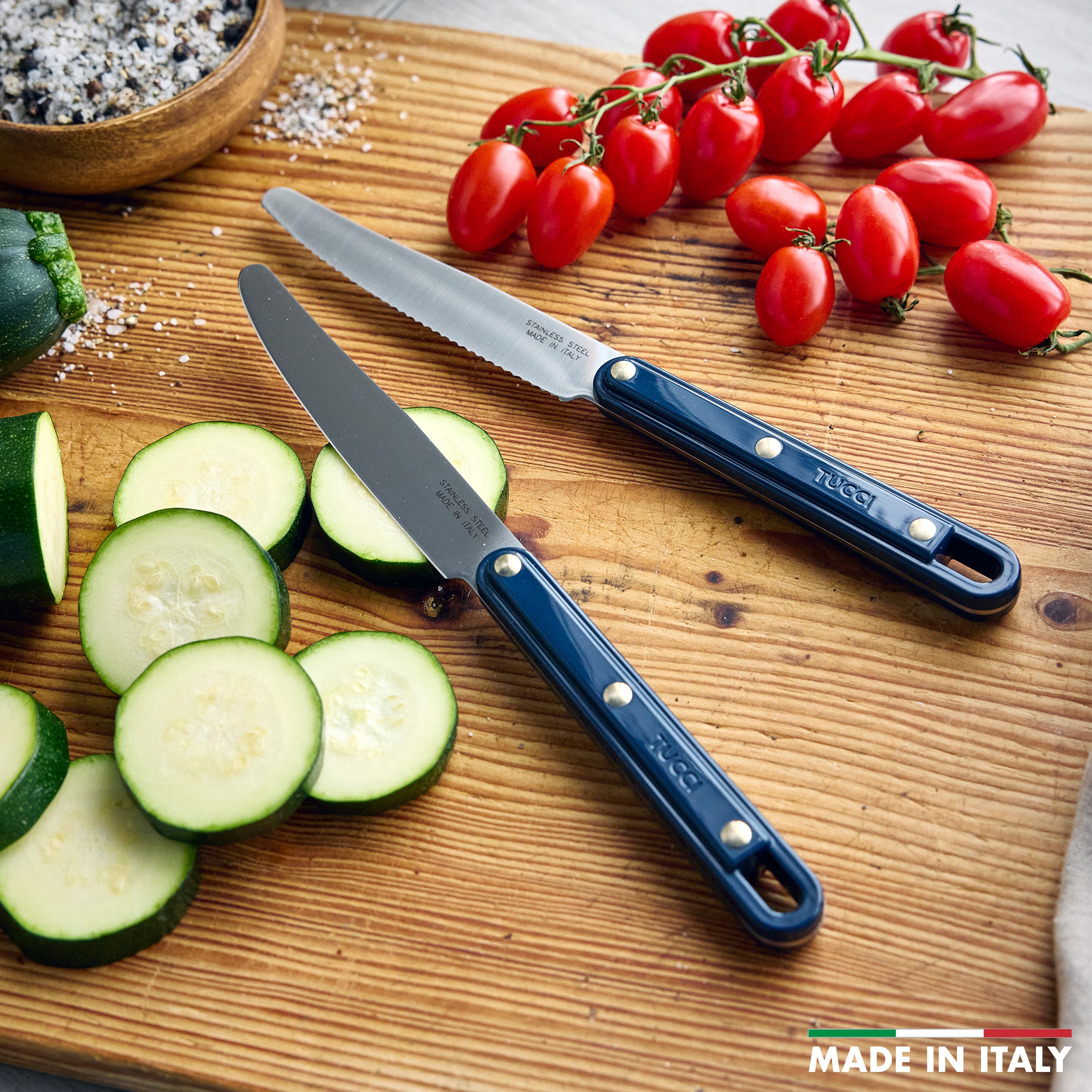 Crafted by Italian artisans, these two versatile knives take inspiration from the knives Stanley Tucci uses daily. The micro serrated knife is ideal for delicate fruits and flaky foods, and the smooth-edged knife is perfect for slicing meats, peeling vegetables, and mincing herbs.