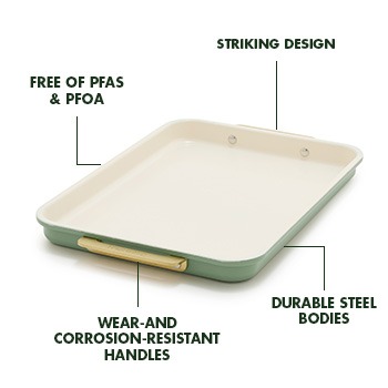 Ideal for smaller batches of cookies, roasted veggies, or snacks, these sheet pans are crafted from heavy-gauge aluminized steel for even cooking every time. Plus, our PFAS-free nonstick allows for easy release, while the gold-tone handles add both durability and style.