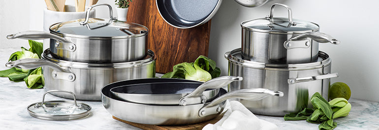 The TriClad Collection takes your kitchen from plain to professional, with each piece crafted from 3-ply stainless steel that features a quick-heating aluminum core. Finished with our healthy ceramic nonstick coating, this collection is built for everyday performance.
