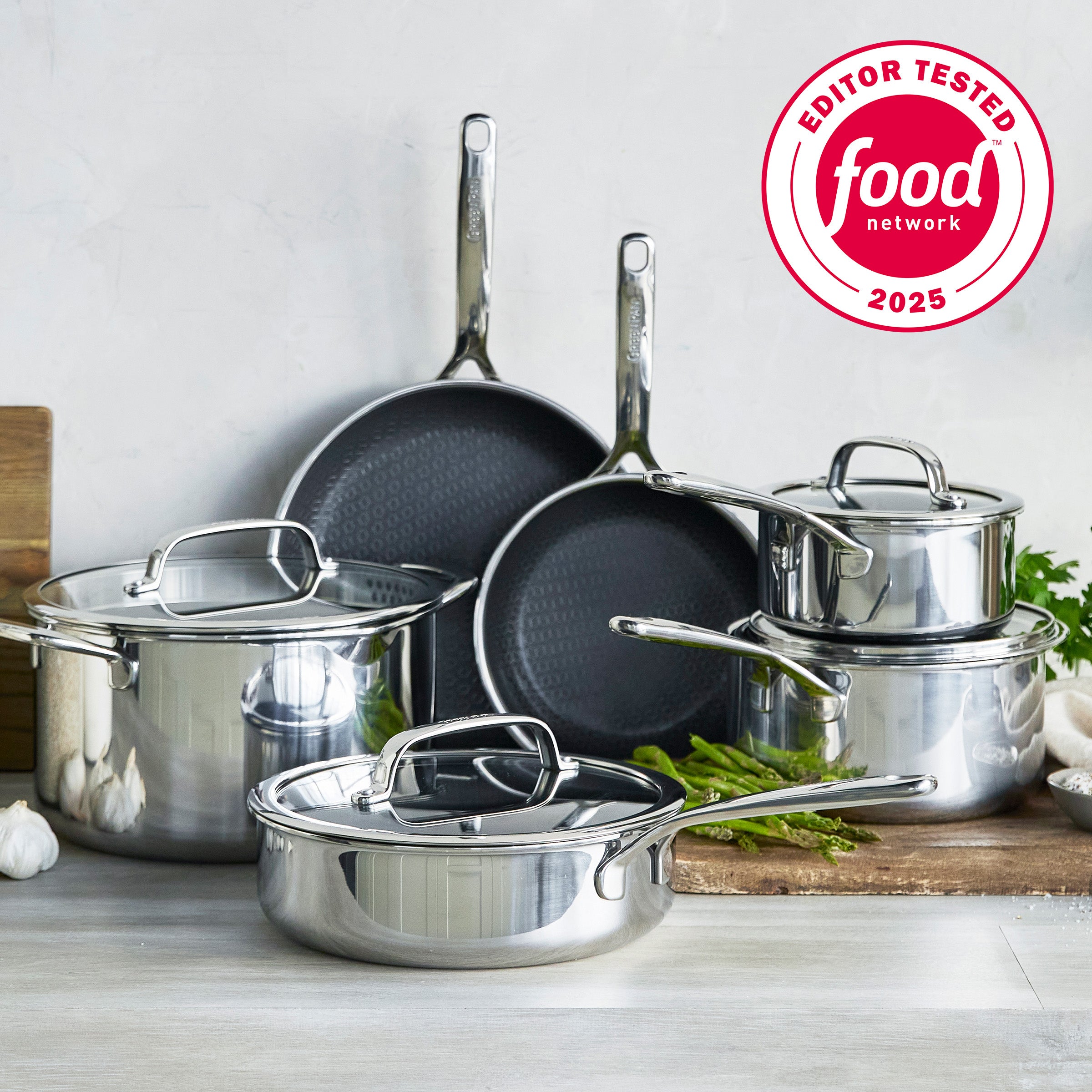 | Construction | Hard Anodized Armored Body Pre-treated for extraordinary durability and scratch resistance | 3-Ply Stainless Steel Two layers of stainless steel with an aluminum core | Hard Anodized Armored Body Pre-treated for extraordinary durability and scratch resistance | Mirrored 3-Ply Stainless Steel Two layers of stainless steel with an aluminum core | 5-Ply Stainless Steel Two layers of stainless steel with a three-layer aluminum core | 5mm Hard Anodized Extra thick for remarkable strength, incredible performance, and extraordinary durability | Aluminum Heats quickly and evenly |