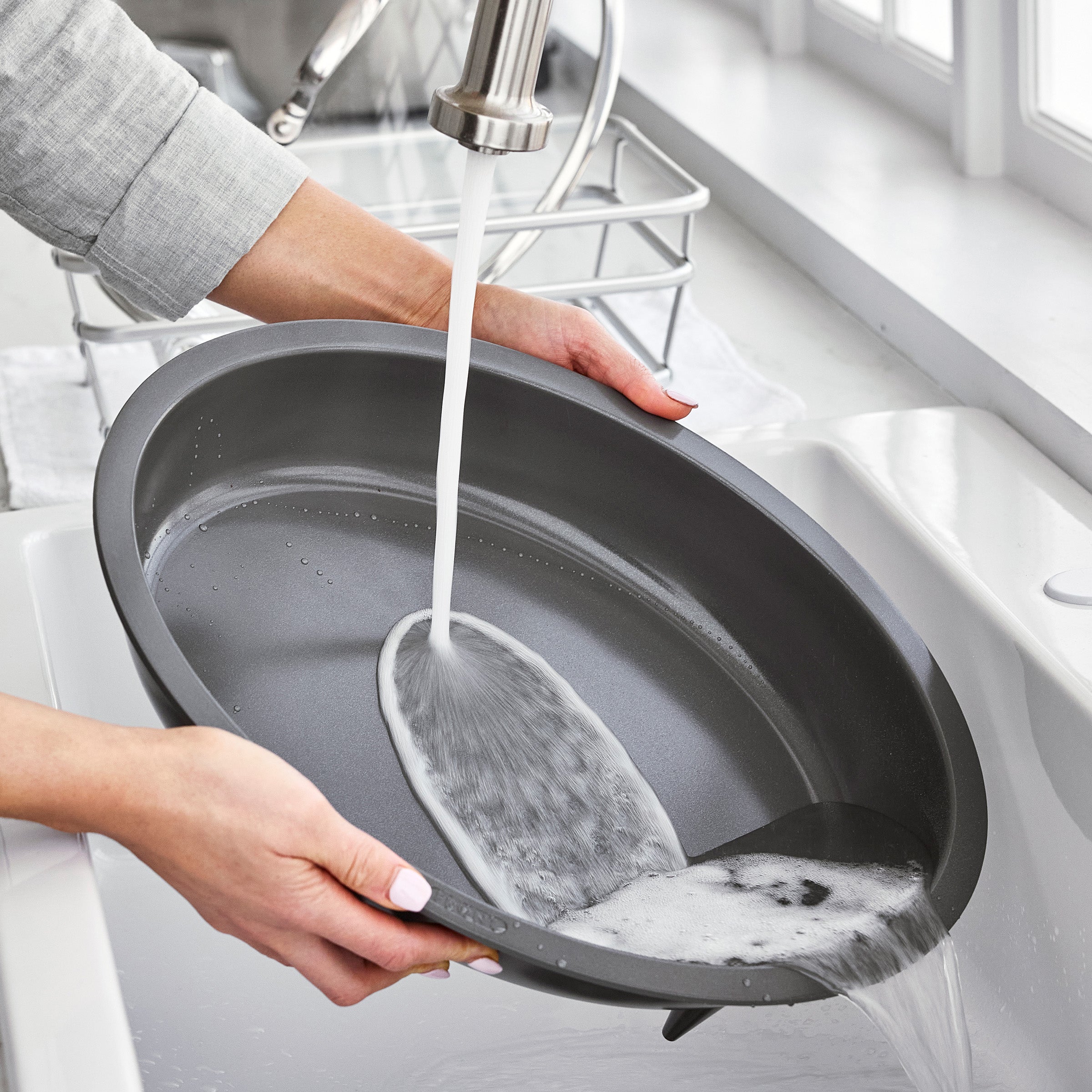 The pan pops out and rinses clean, plus it’s dishwasher safe for tough messes