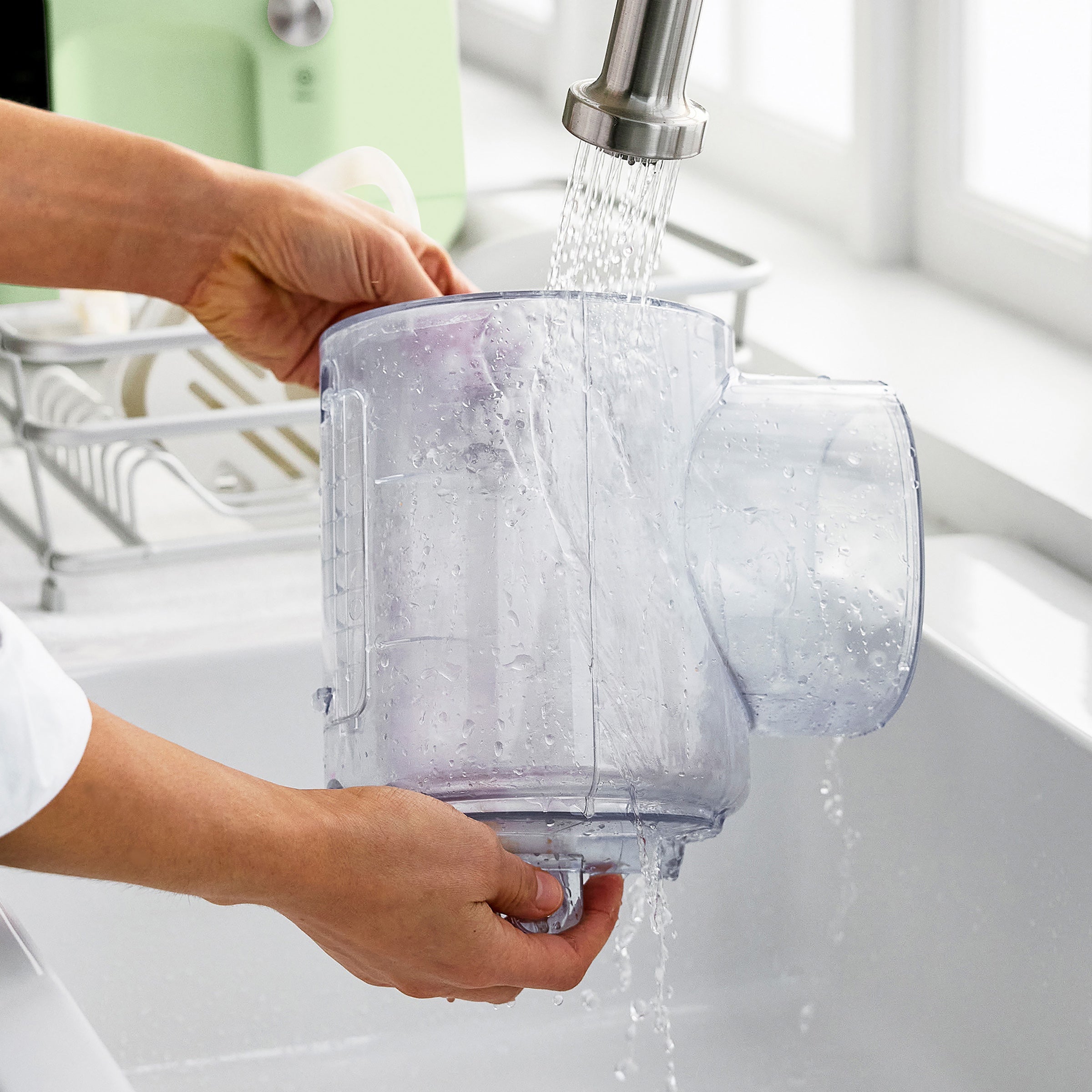 The stirring blade, mixing bowl, two-part removable drip tray, extrusion head, cleaning brush, and removable decorative cover are top-rack dishwasher safe.