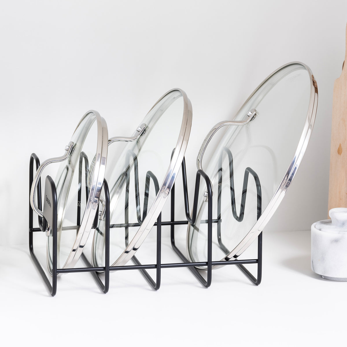 Perfect for drying after washing, this lid organizer fits up to four separate lids, large or small. For horizontal use only.