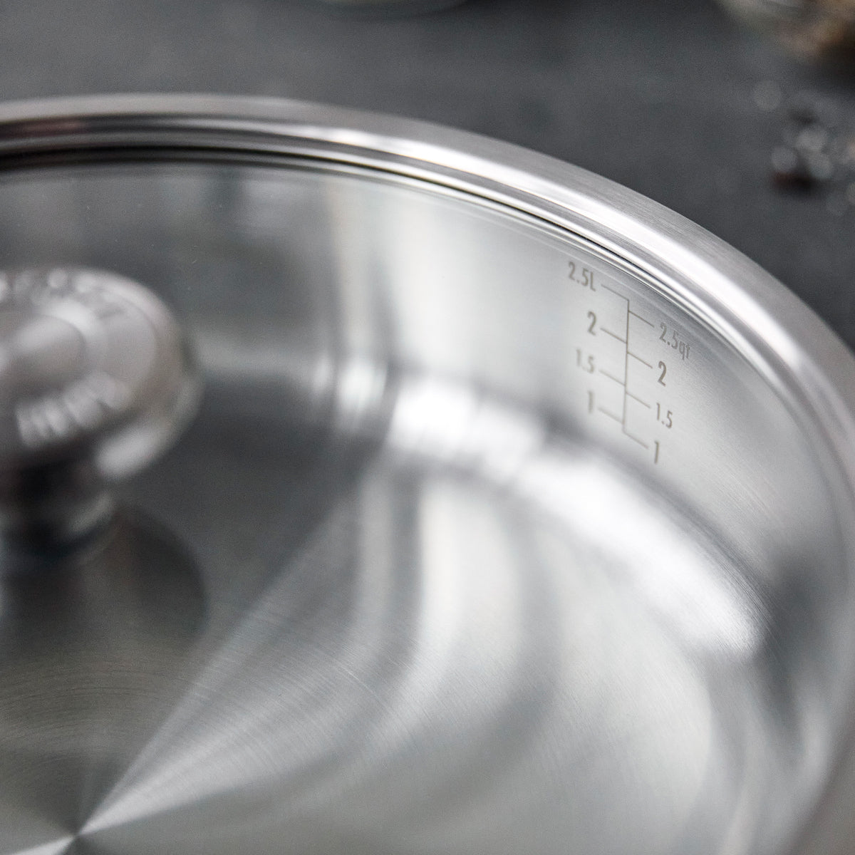 Capacity marks inside the pots and pans offer an easy guideline and a quick reference for proper measurements.