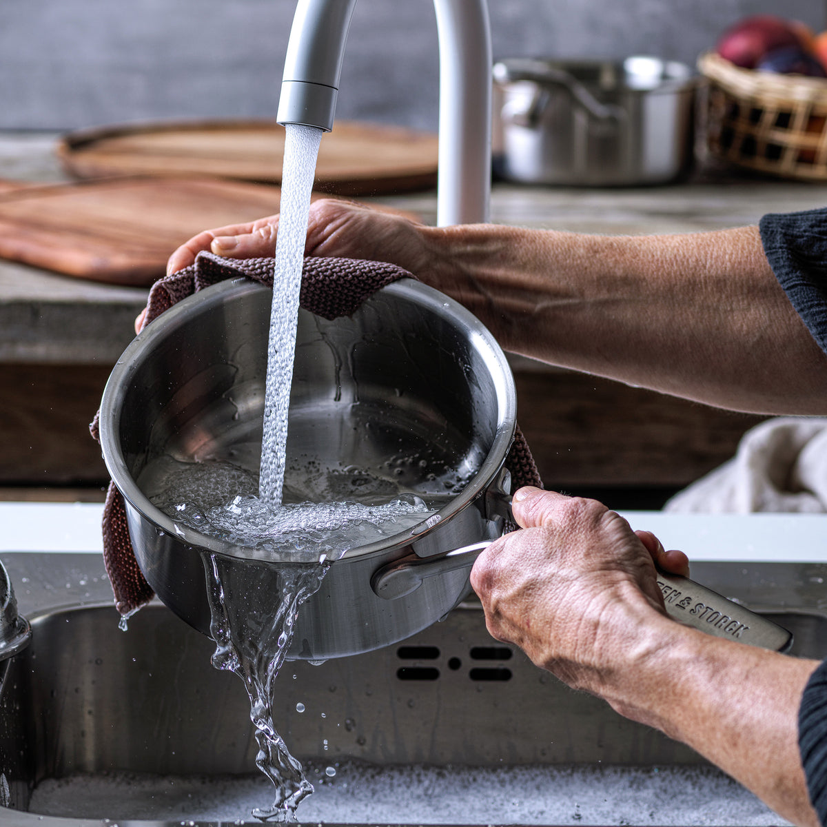 Wash in warm soapy water, rinse, and dry thoroughly with a soft cloth. Hand washing is recommended, but Merten & Stork stainless steel cookware is also dishwasher safe. Need something a little stronger? Baking soda is our go-to, you can boil the water with baking soda first for tough stains.
