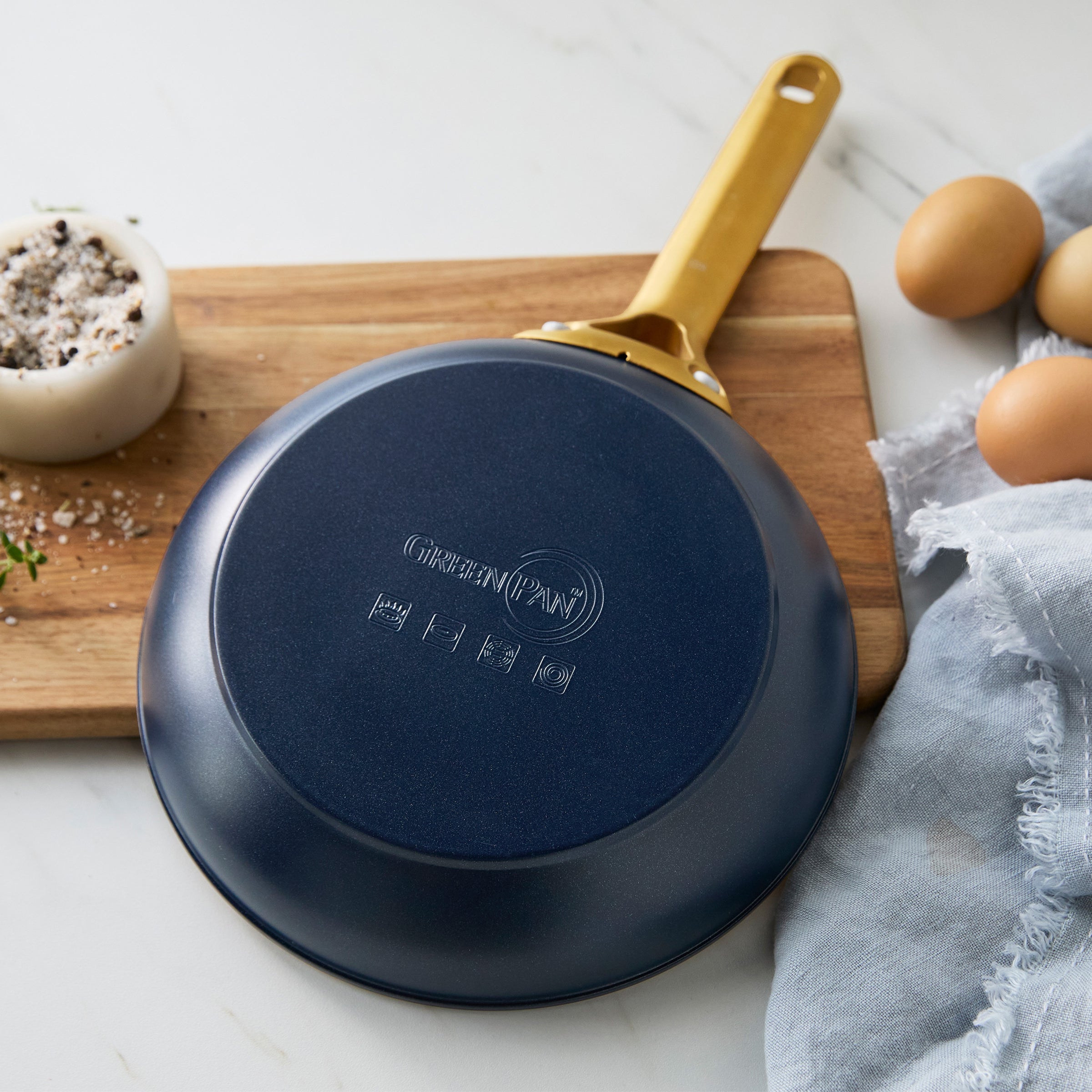 Dark blue frying pan with a gold handle on a kitchen counter with eggs and a cutting board.