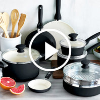 This handy frypan set is raring to whip up the best scrambles, veggie sautés, and fried fish you’ve ever met. Featuring our Thermolon™ healthy ceramic nonstick coating, these pans are made without PFAS, PFOA, lead, and cadmium for worry-free cooking.