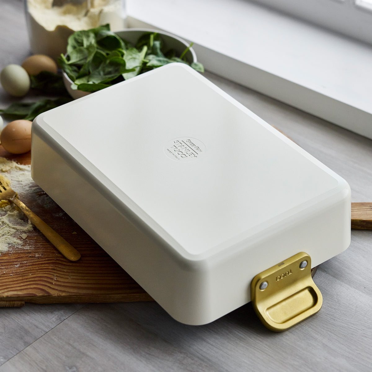 Deep and spacious, this lasagna pan is ideal for crafting casseroles, desserts, roasting, and big one-pan meals. The cast solid handles are clean, simple, and functional while the heavy-duty body heats quickly and evenly, eliminating hot spots and offering total control over the meal.