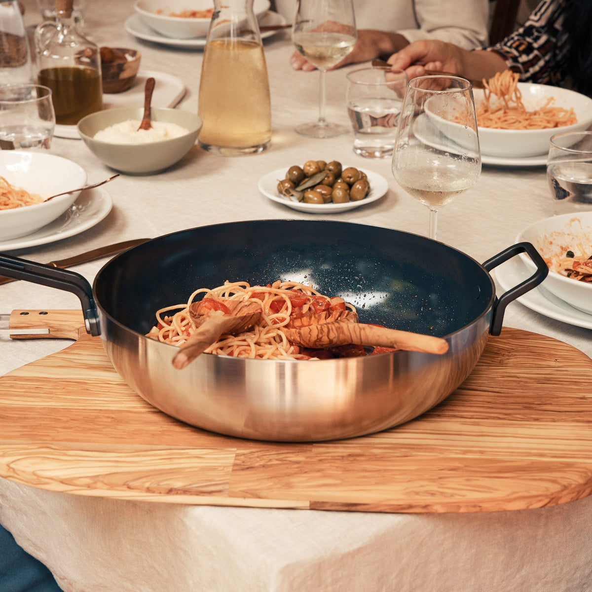 Soft, rolled edges offer a contemporary flair that honors the shapes of the Stanley Tucci cookware collection