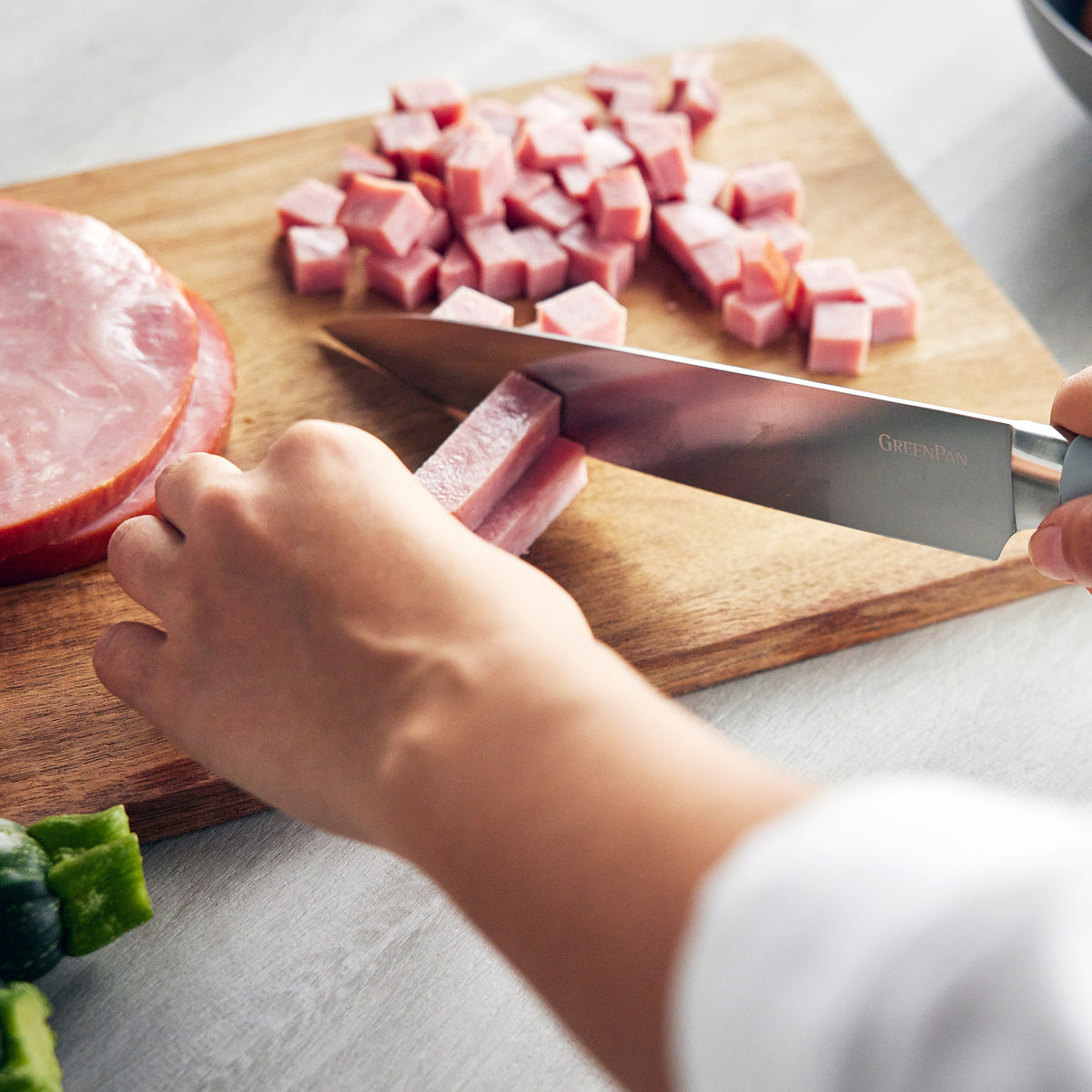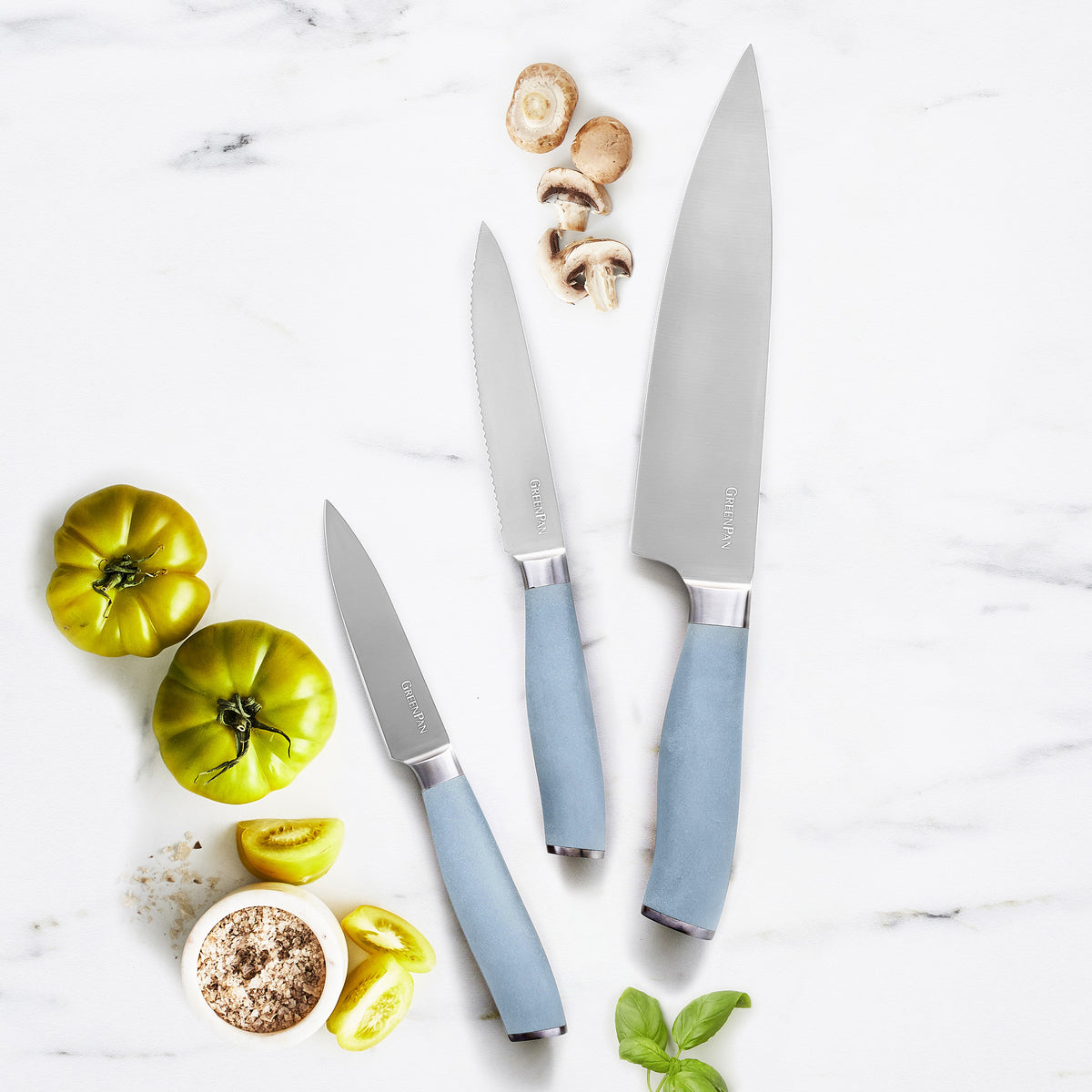 This do-everything 3-piece knife set combines both versatility and durability with eco-friendly blades made from recycled stainless steel. Get small tasks done quicker with the 4" paring knife, slice effortlessly with the 5" serrated utility knife, or conquer a variety of culinary duties with the 8" chef’s knife.