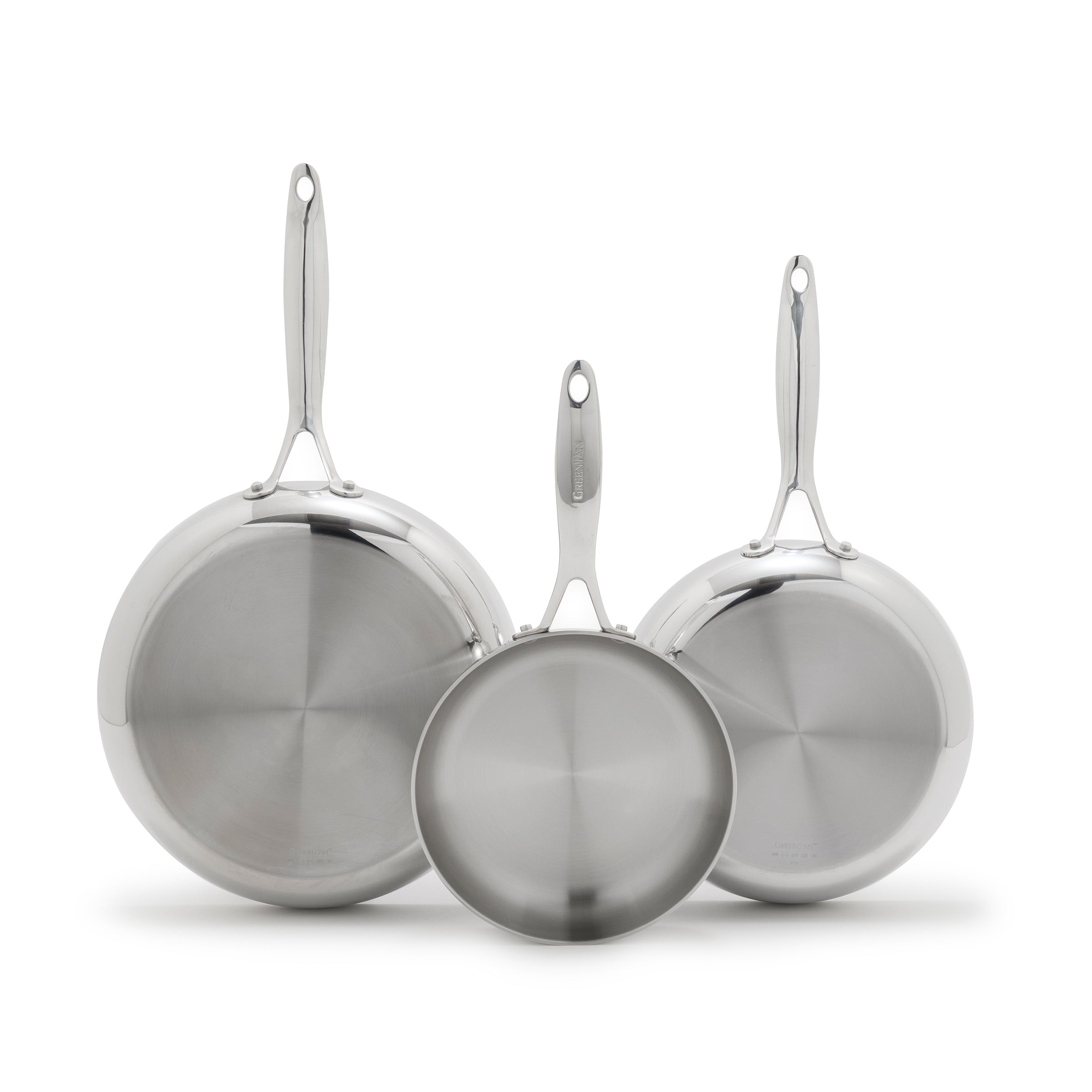 Featuring a frypan for every task, this 3-piece set is crafted from multilayer stainless steel for fast, even heating and lasting strength. From quick morning eggs to golden chicken thighs, sizzling steaks, and so much more, this tri-ply trifecta handles it all.